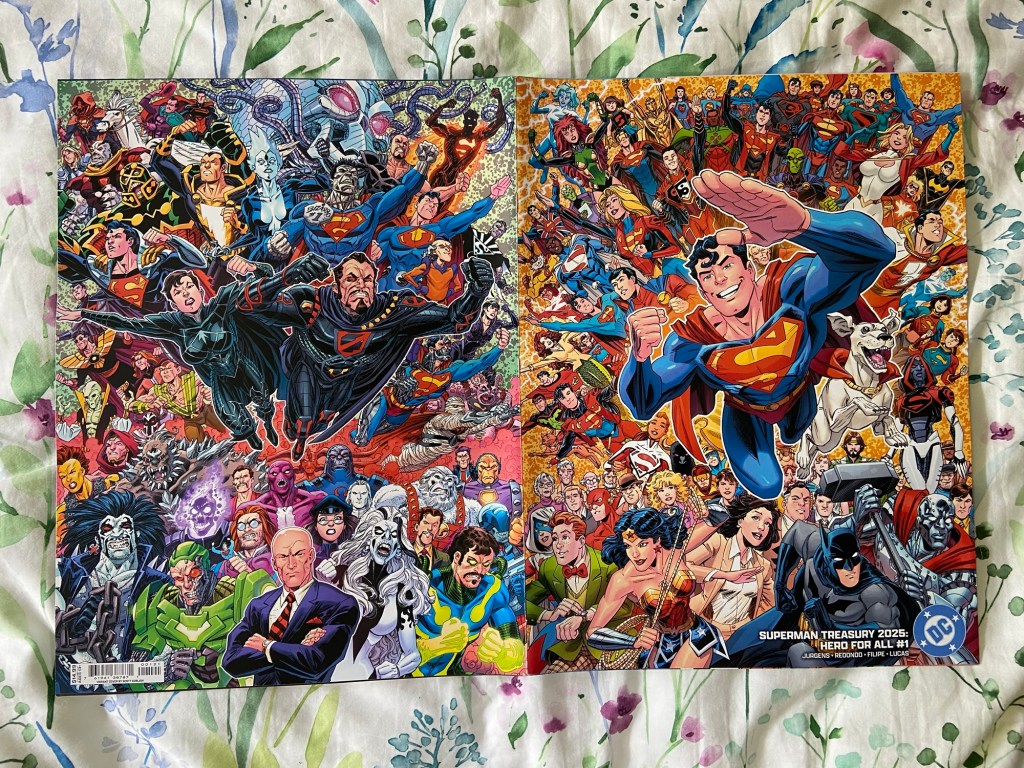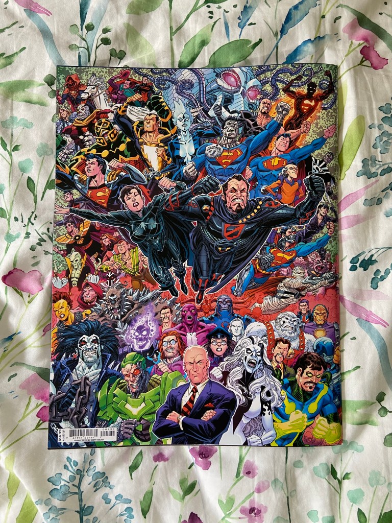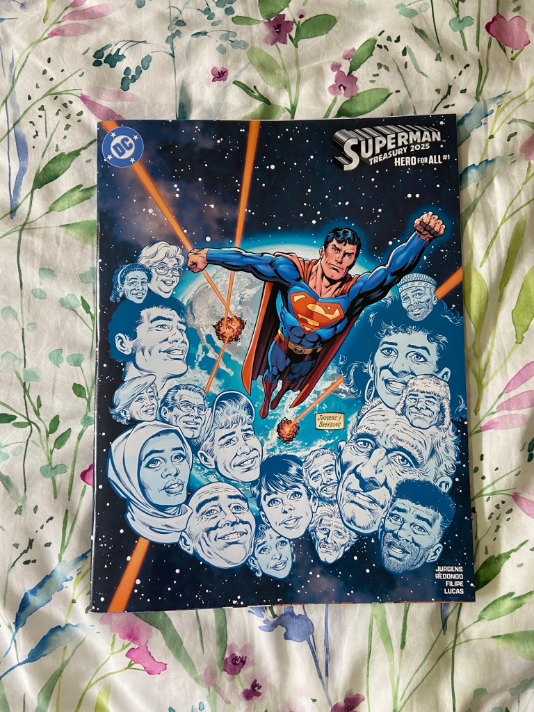 Clark with the faces of people from around the world exemplifies what he is to everyone. I’m happy that Jurgens and Breeding got to do a cover! The main cover had the classic crest on the back, and so did this one.