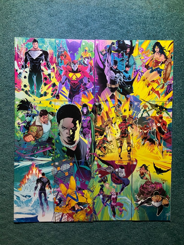 Having said all that, I do love that this image feels like it’s storyboard for a big comicbook movie event! There’s so much going on that you want to look at every inch of it to find something you hadn’t noticed before. And as I said, the art itself is amazing! There are two photos because I wanted to get the light on both ends but with the angles I had to work with, I couldn’t make it work. Hence, after this, sets with 12 or more, had photos take elsewhere.