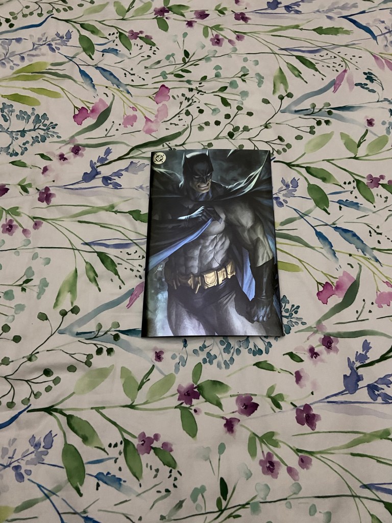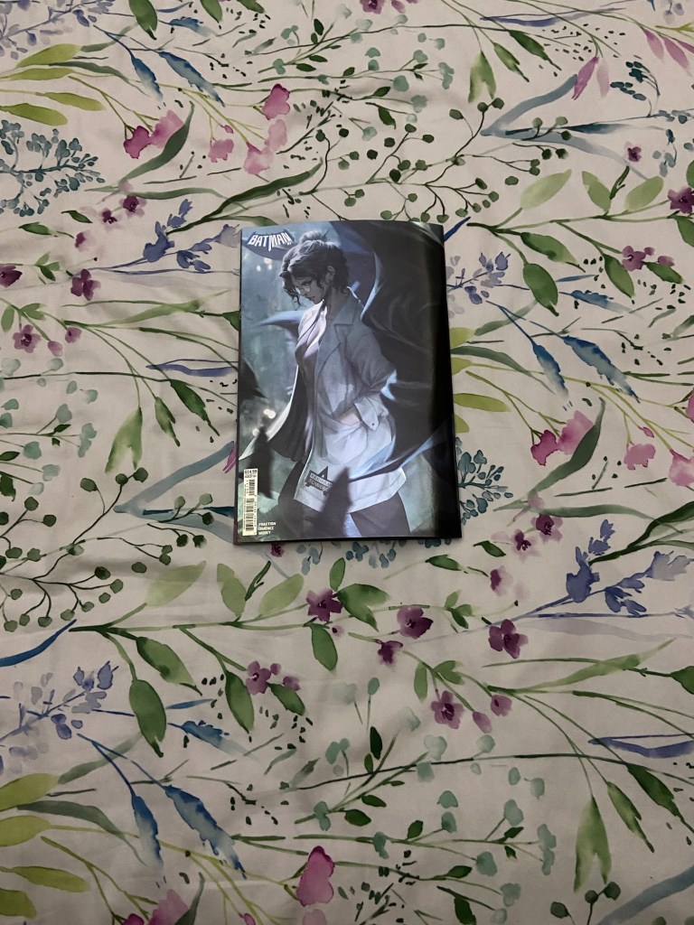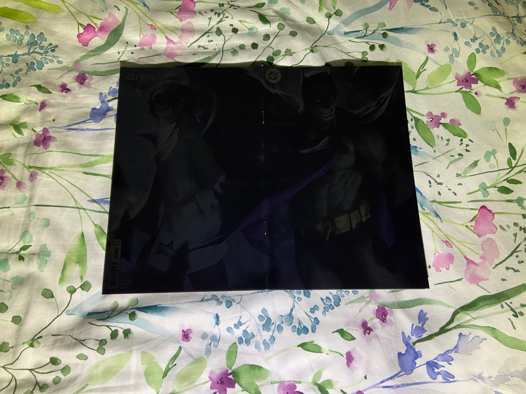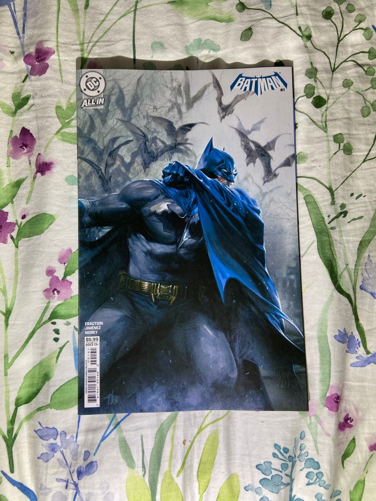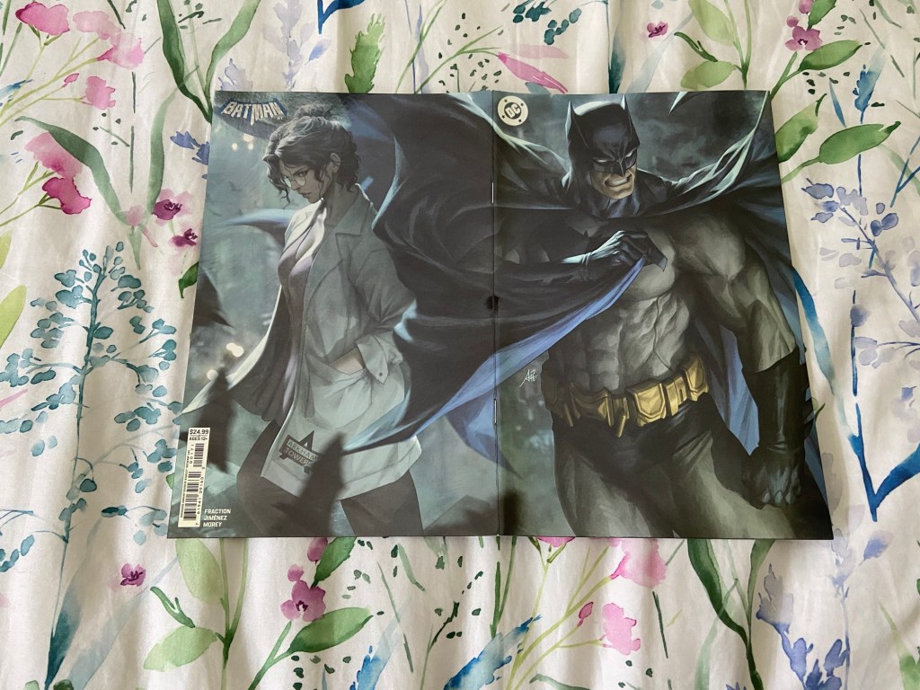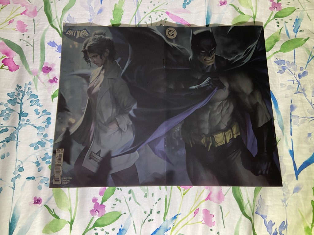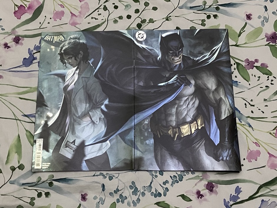The first is by Gabriele Dell’Otto, I liked the blue being accentuated and the bats. The new logo is cool. And I was happy to see an Artgerm cover and a wraparound at that! And the cover I got in the bag was the foil variant of the Jim Lee cover.