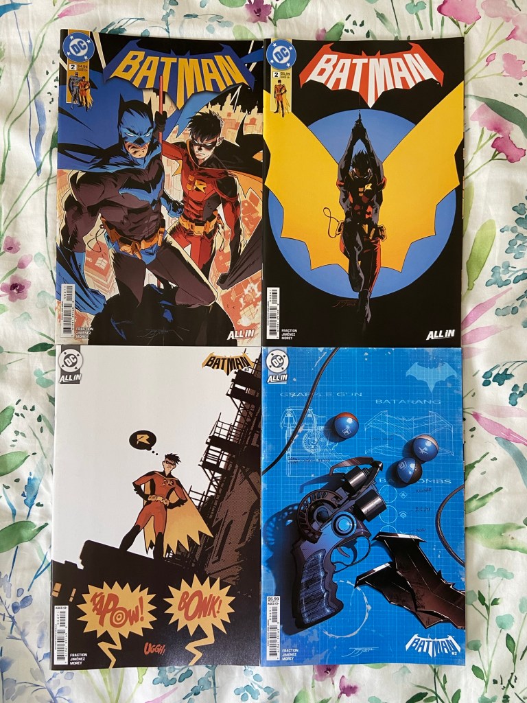 The main cover by Jorge Jiménez is so good! The lighting on them both looks great! The first variant is in reference to the main cover of issue 1. The next is a fun Aja cover. And then Jiménez is also doing these Bat-Gadget covers too.