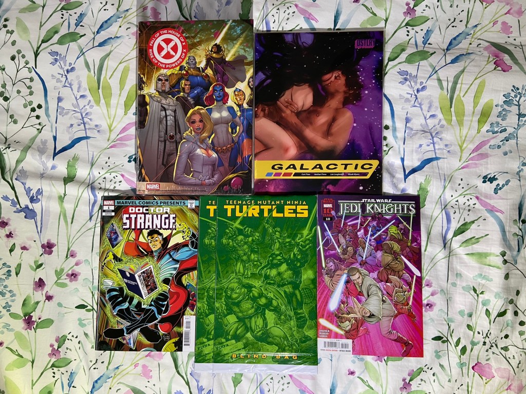 Fall of X omnibus with David Nakayama’s variant cover that I’ve been pushing taking home from my box. A late variant from Galactic. And just a couple variants and another copy of Jedi Knights 10.