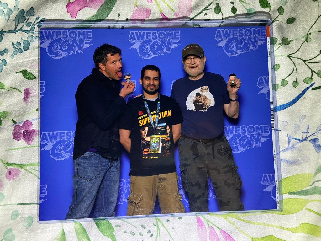 Next was another photo-op, the Supernatural team-up. Misha and Jim enjoyed the Funkos of their characters that I brought for the photo. Misha took the Bobby one to hold, and so Jim took the Cas one and said he got the pretty one. The photo is fun!