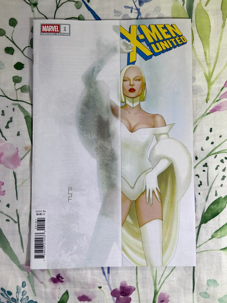 The main cover and variants for this issue that I got. The connecting covers are by Stefano Caselli. Now, I don’t know why they didn’t make this a wraparound cover. It would have been better than making the connecting part also a variant of the main cover. It’s just weird. Also, well, you’ll see in the next post. But the design looks great! Emma Frost looks amazing in both the Forbes variant and the Momoko variant respectively.