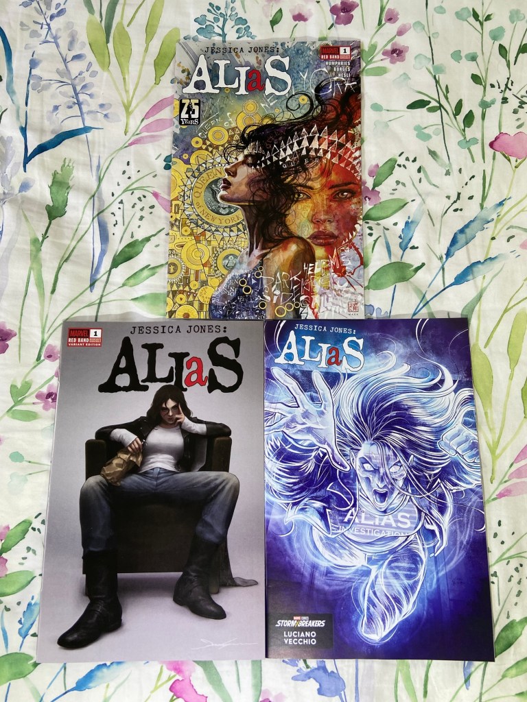 David Mack. On the main cover for this Alias run. Amazing! I love all the main covers that I’ve seen so far! The first variant here is by JeeHyung Lee, it looks so good! And the last variant is a fantastic Vecchio variant!