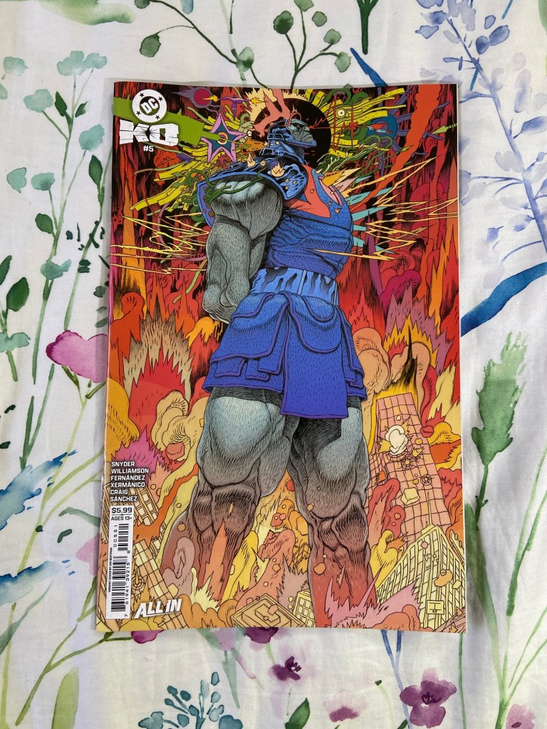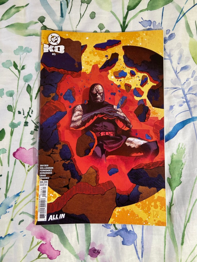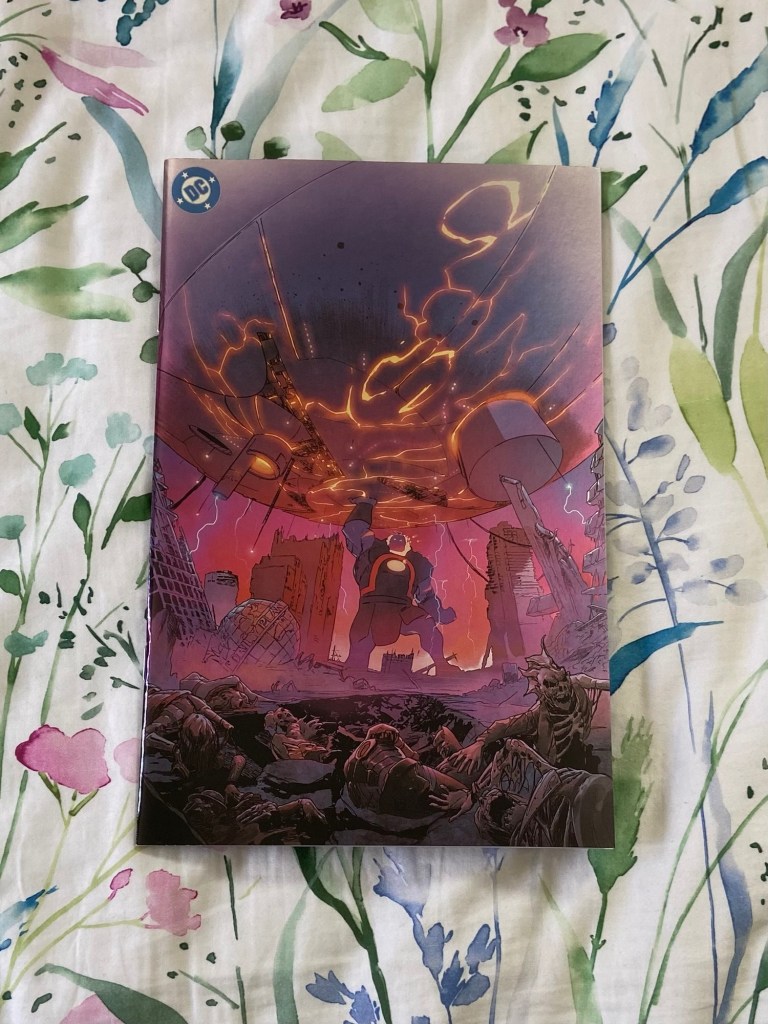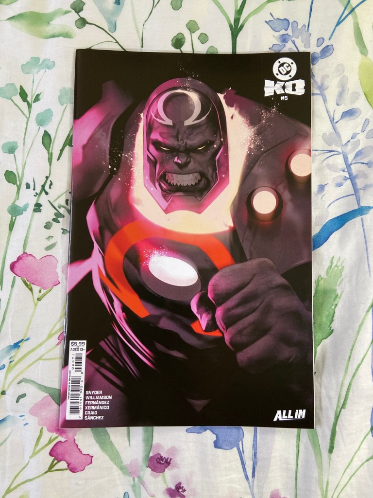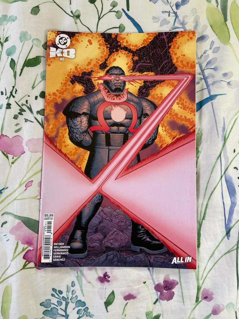 The first one is a foil cover of the main cover but without the acetate cover. This is by Javier Fernández and Alejandro Sánchez. I don’t have much interest in the wrestling variants, but Darkseid is right there. Dan Mora is fantastic. Mike Del Mundo did such fantastic art on this variant of Darkseid sitting inside earth like a throne. It looks like a classic design. Ian Bertram did the next cover with Darkseid looking like a mural. Darkseid baring his teeth at us is done really well by Ben Oliver. Steve Skroce made the Omega Beams look great! I think there are a couple more variants of this that I need to find.