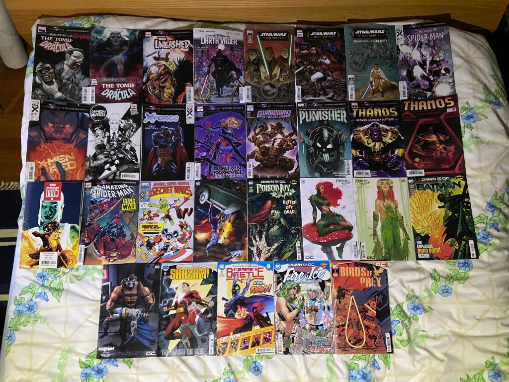 I’m intrigued by the current story in Scarlet Witch. We got another Halloween themed special from Marvel with another Crypt of Shadows one-shot. She-Hulk got a new run. I think this Catwoman issue is the final issue for the Gotham War event. This is Superman’s 850th issue, I actually forgot that, I may have to get another copy. I’m wondering how Swamp Thing and City Boy are going to interact. And I think this is the last Golden Age issue 1 we have with Jay Garrick. I think more than half of this pile were variants. I may need to watch out for that, haha.