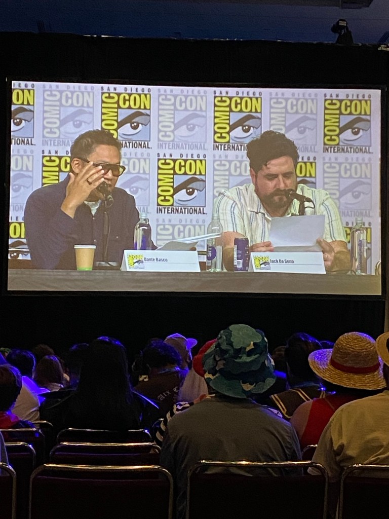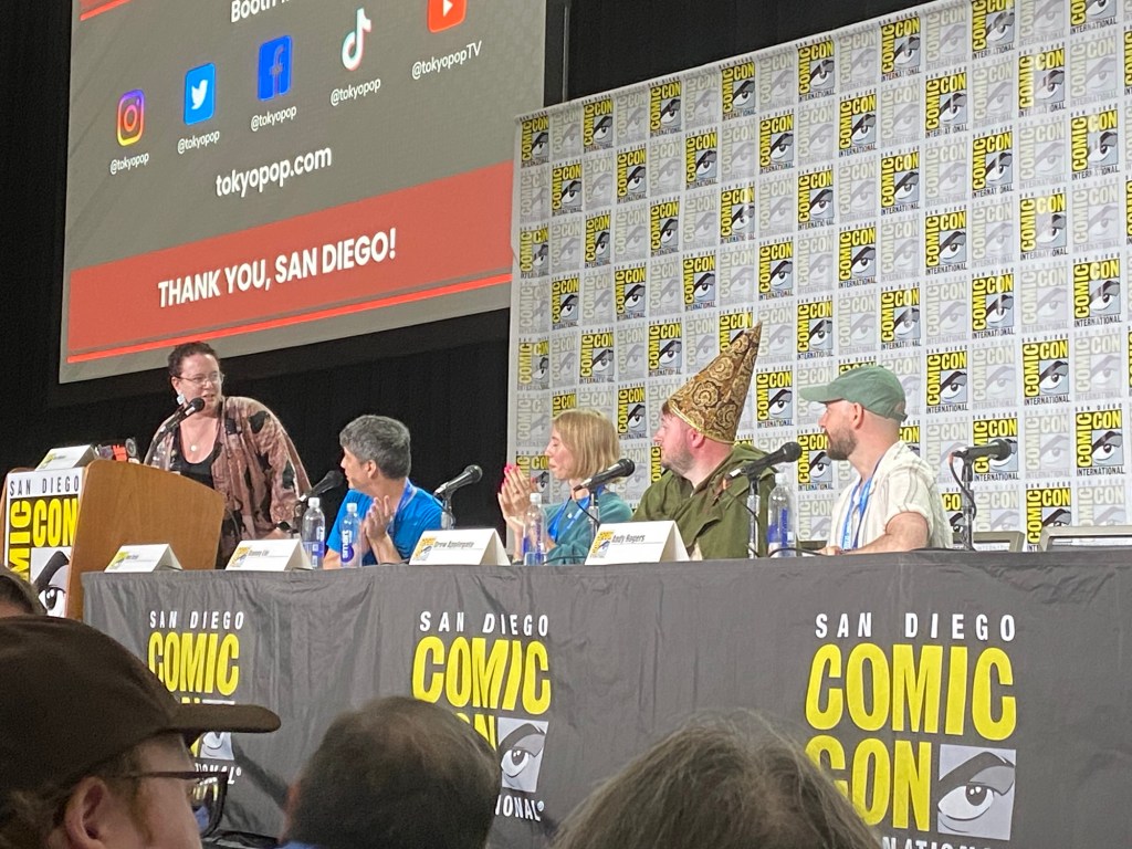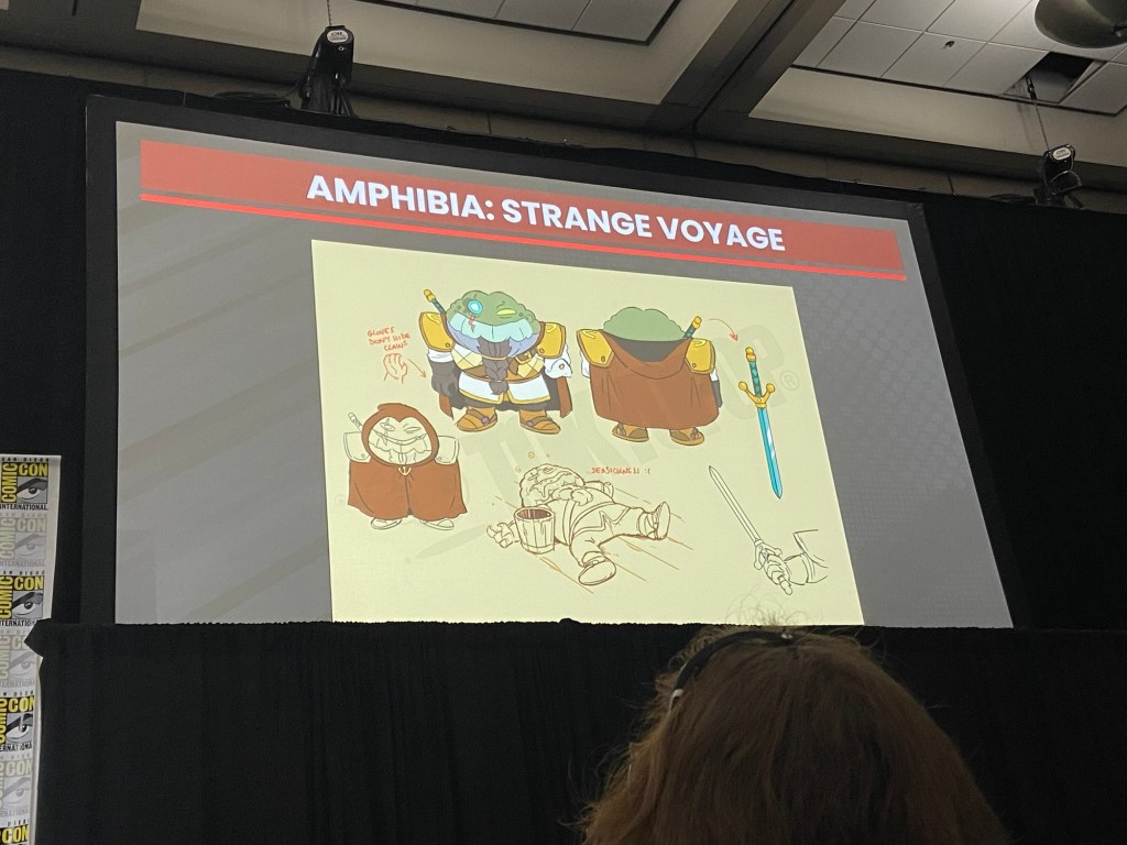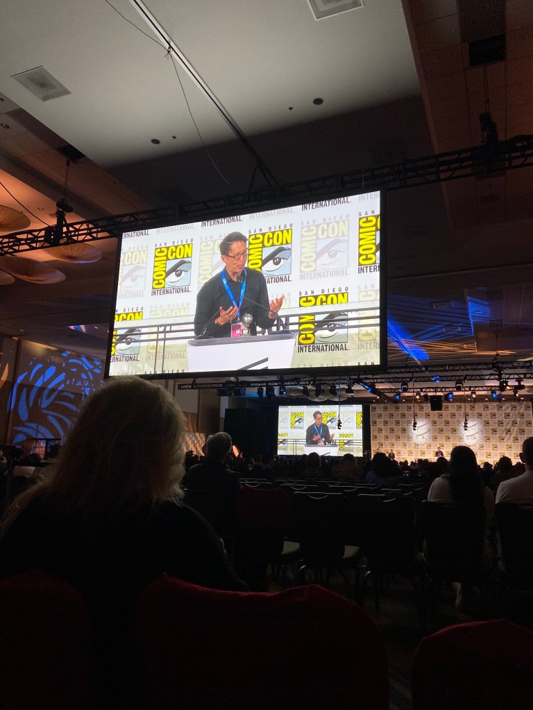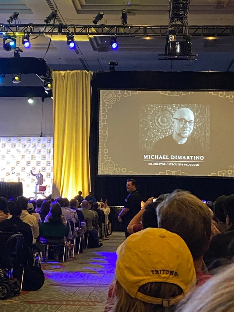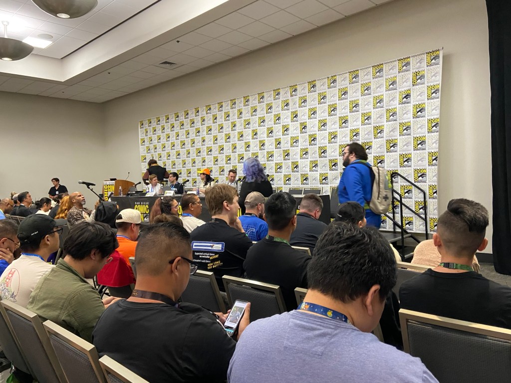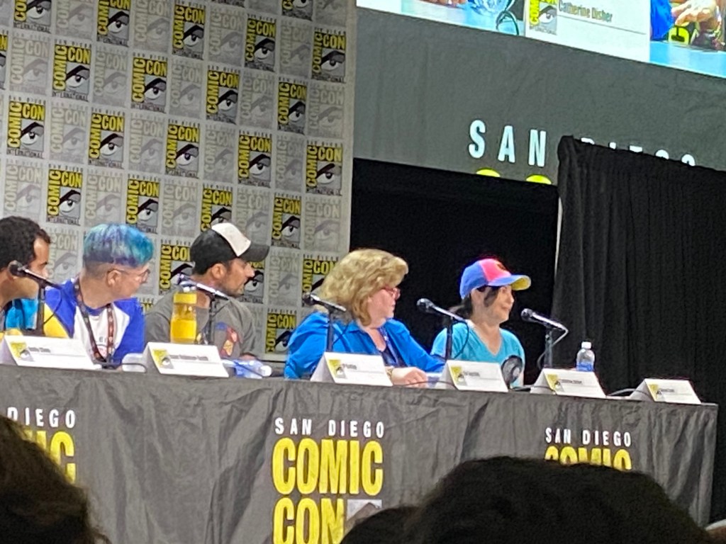 10:35-11:30 – The panel that day for me was the Amphibia panel with Matt Braly (the show’s creator). It was a wonderful look-back at the show and an intriguing look forward to the upcoming comic miniseries. It was nice to have this panel because as Matt said, when the final season of the show aired it was the pandemic, so there was no SDCC, and thus, no Amphibia panel. He said he really would have liked that to have happened. He and the other panelists (who were storyboard artists from the show) talked about the show’s art book and Marcy’s journal that were both made in collaboration with TokyoPop. I had actually forgotten that he was creating a comic set after the events of the show. So it was great to hear news about it. We got to see some promo art and then some unfinished pages from the first issue, the last page of which had us all tearing up from the emotions it brought down on us. I really enjoyed this panel. On the way out I saw podcast host Hector Narvarro sitting in the front row, he was there because his girlfriend is an anime voice actor and she was one of the panelists on the next one. We fist-bumped quickly. I had seen him back at SDCC 2019, also very briefly.