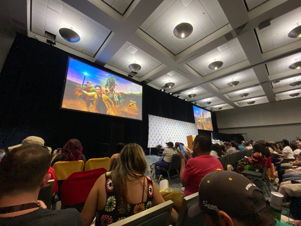3-4pm – My final panel of the convention was the Jurassic World Chaos Theory panel. It’s a sequel series to the JW: Camp Cretaceous animated series from around when the pandemic first hit. The first series took place after the first Jurassic World movie and this second one is 6 years later, between the second and third JW movies. It was so lovely to see the cast together. Season one was talked about a lot and season two was hinted at a bit. And the panel ended by us, and the cast and crew watching the first episode of season 2 together! The season won’t drop until mid October, so it was really great to see the episode now.