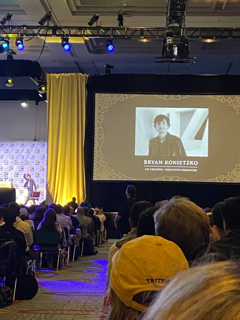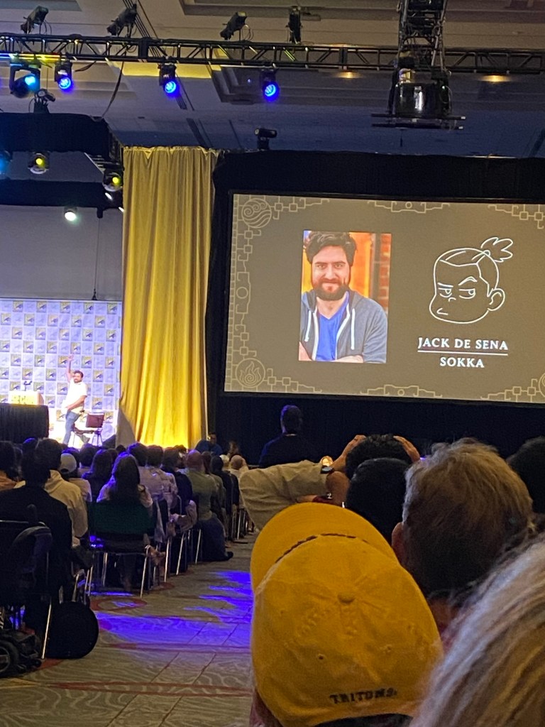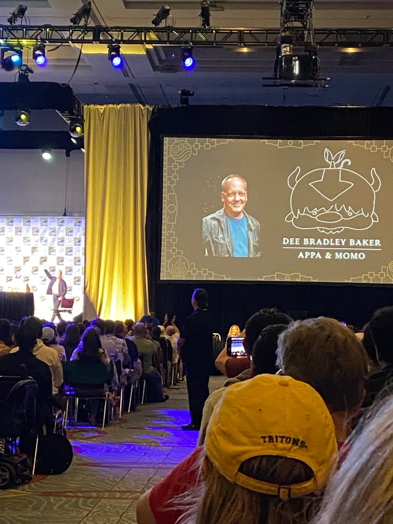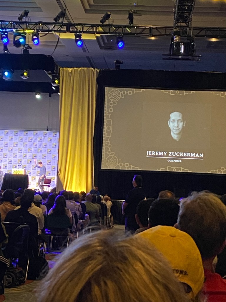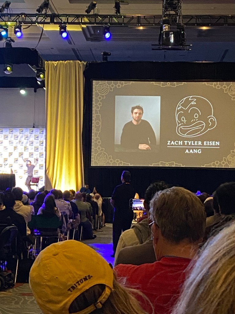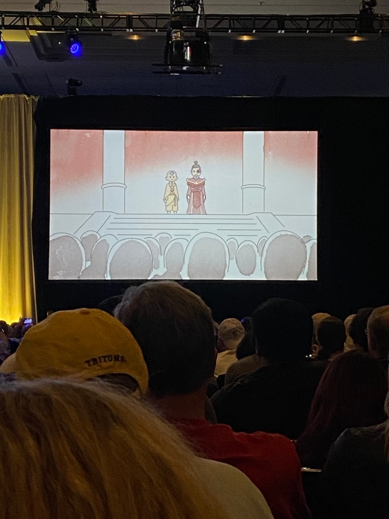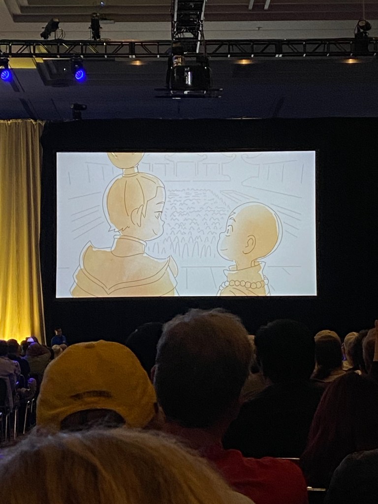 10:00-11:07am – ATLA 20th Anniversary panel. They chatted about the anniversary itself of course. Each person gave a little intro. Then talked about what they’re all doing currently. We always got a video message from Mae Whitman (VA for Katara) saying she was sad that she couldn’t be there but was excited for the anniversary. Similar to last year’s Braving the Elements panel, we got some table-reads of some scenes from ATLA! The first was the Sokka and Suki scene from the station when they tried to enter Ba Sing Se the first time and then after that at Serpent’s Pass. The next one was at the Western Air Temple when Zuko wanted to join the team. Differently than last year, for each scene there were new sketches to go with the scenes drawn by Bryan. He also mentioned that he was working on something watercolor-related for Avatar Studios. Zach talked about his time after the show and how much the show means to him. Janet talked about Greg Baldwin and Mako (both the VA’s for Uncle Iroh)for a bit, before Dante reminisced about Mako. Each of them talked about which characters they related to most. The last table read was from the Sozin’s Comet finale, right after defeat of Ozai and up to Zuko’s speech at the end. Mike Talked a little bit about merchandise coming out. We were reminded that the day of the Aang movie is Oct 9, 2026. And finally, we got to see the first promo image from their next animated series (Avatar: Seven Havens)!! And lastly, Jeremy gave us a musical preview of the 20th Anniversary concert tour via Secret Tunnel! And Dee (and the others) were singing with all of us. This was such a fun panel!