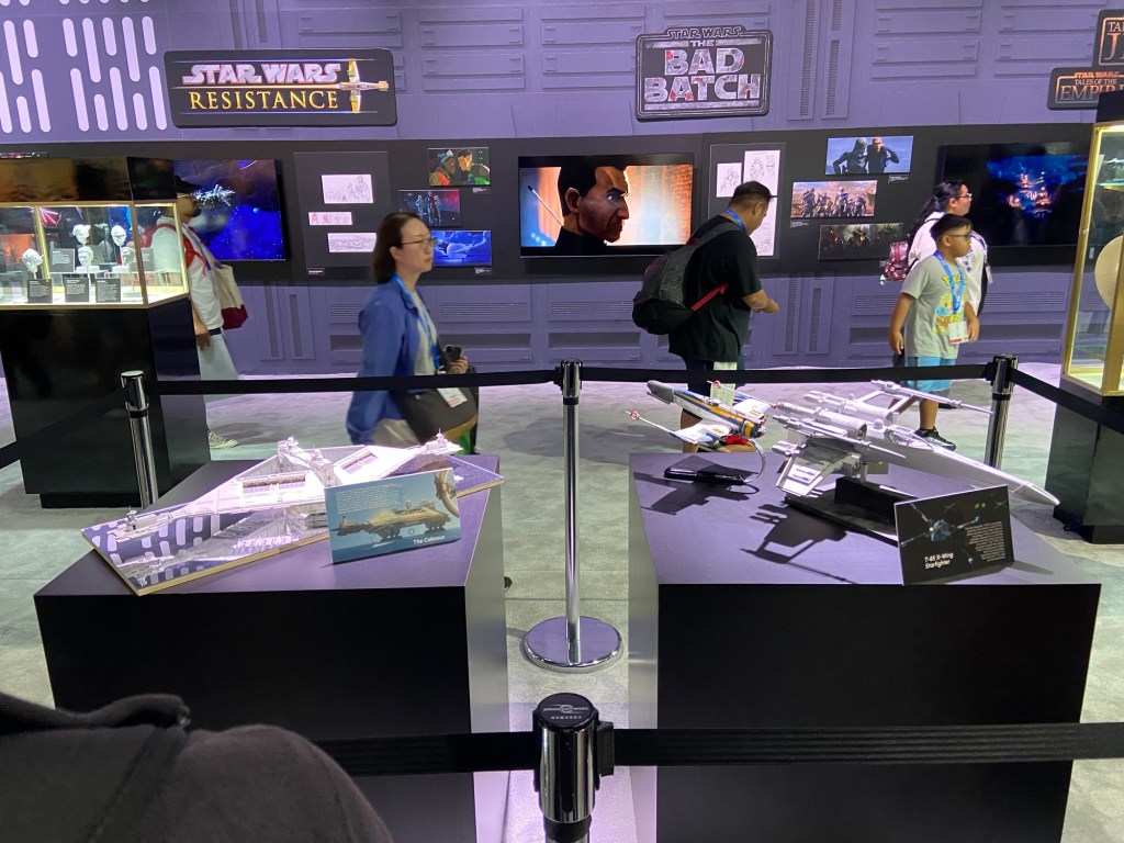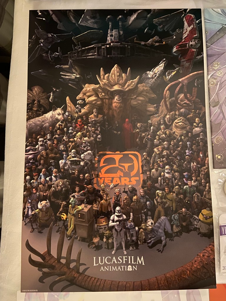 7:46-9:00am – So, on Thursday, I was in the exhibit hall and noticed people carrying posters, there are some free ones that get passed out daily. When I saw the posters themselves, I did a double-take and freaked out! It was the 20th Anniversary poster for LucasFilm Animation which was given out earlier this year at Star Wars Celebration. The moment I saw it months ago, I knew if have to probably find it on eBay or something. So when I saw that poster, I rushed around to ask where people got it. It was of course at the Star Wars booth which is not been to yet. Once I got there, I learned that it was given out in the mornings and afternoon. At that time on Thursday it was around 4pm. So, on Friday, I went there at 2 something pm and they had already been given out. I couldn’t rely on the afternoon drop, so on Saturday, I waited in line to get into exhibit hall as early as I could to get one in the morning since that was the only exact time I knew they’d be given out.