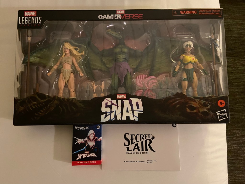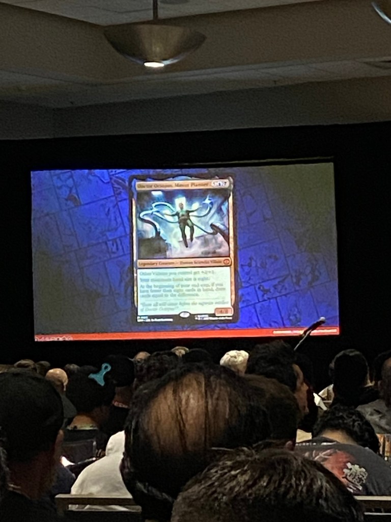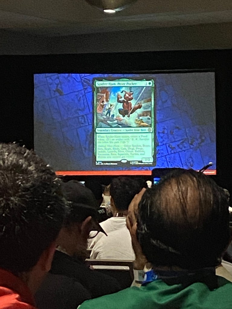 12:32-1:27pm – MTG Spider-Man first look panel (Room 7AB, a VERY small room). We saw a bunch of Spider-character card reveals, learned about new mechanics and stuff. It was enjoyable. Though, there was no free promo card at the panel. That’s one reason why there were so many people lined up, almost every MTG panel had some kind of social media post suggesting that there could be cards at the events.