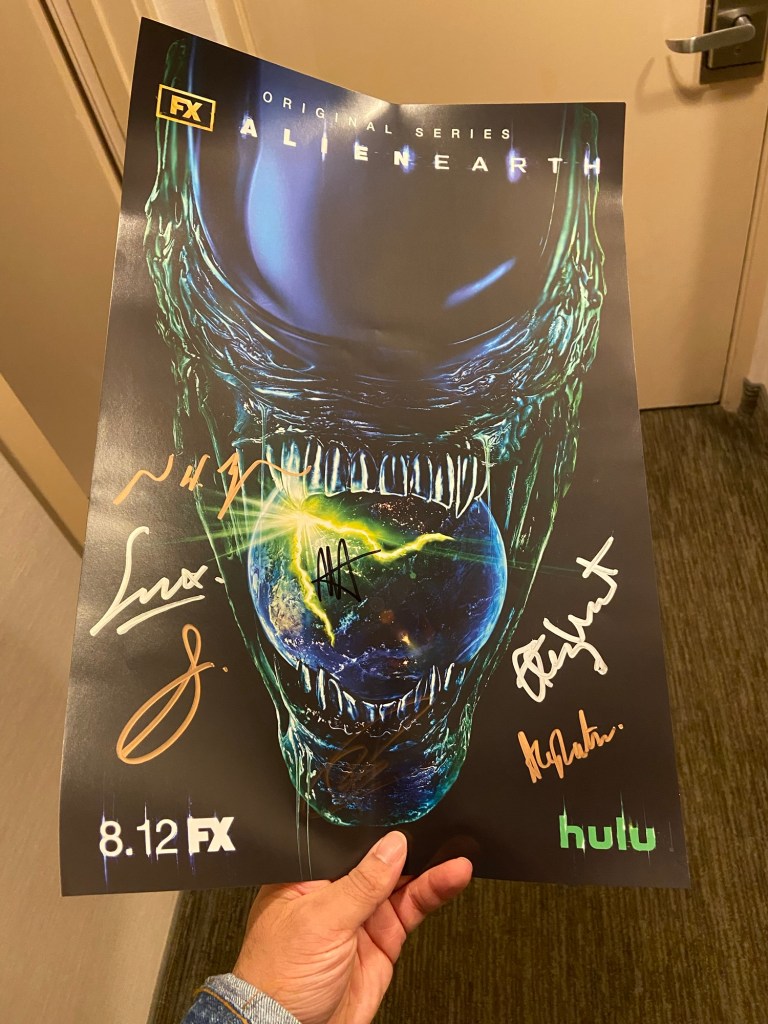 2:48-3:35pm – I got in line for my first signing via the exclusives lottery. I did get a signing one other time in my first year, but it was on Saturday and I was in Hall H all day. This was the aforementioned Alien: Earth cast and showrunner signing!! I met the cast of the show, and I let them know that I saw an early test version of the pilot last year and I was hooked! They were visibly very excited that I’d seen the episode and that I liked it.