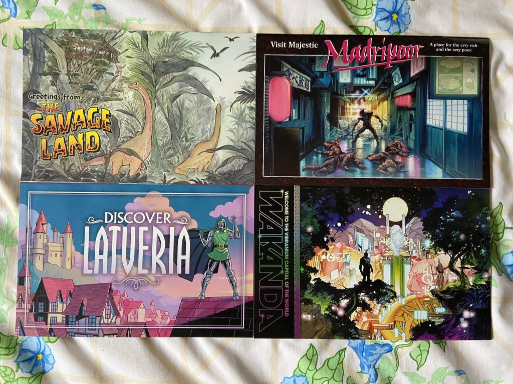 These are the post card variants from this year that started on May 18 and finished on July 6th. the Savage Land one is from Peach Momoko. The Madripoor one is from Carmen Carnero with colors by Romulo Fajrado Jr. The Latveria one is from Natacha Bustos. And the Wakanda one is from R.B. Silva with colors by David Curiel. I would love to see this theme of variants continue. Landscape variants are always fun to see pop up.